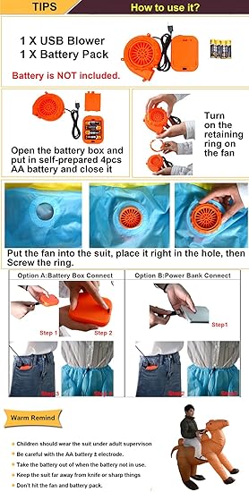 Inflatable Costume Blow Up Suit Sports Party Game Fat Cosplay Animal Fancy Dress Halloween Costume Jumpsuit Christmas Costume Gift Fancy Dress Cosplay Outfit Gift FEATURE: MATERIAL:100% Polyester SIZE:suitable for the people between 4.9ft (1.5M) to 6.2ft (1.9M) . USB fan design:requires 4 AA batteries and USB connected mobile power,faster and more convenience to use. PACKAGE INCLUDE: 1 X Inflatable Costume 1 X USB Mini Fan Blower (not include battery) you can walk, run, jump, ride when wear the inflatable costume,will have a pleasant weekend, holiday or party fun with your friend,parents