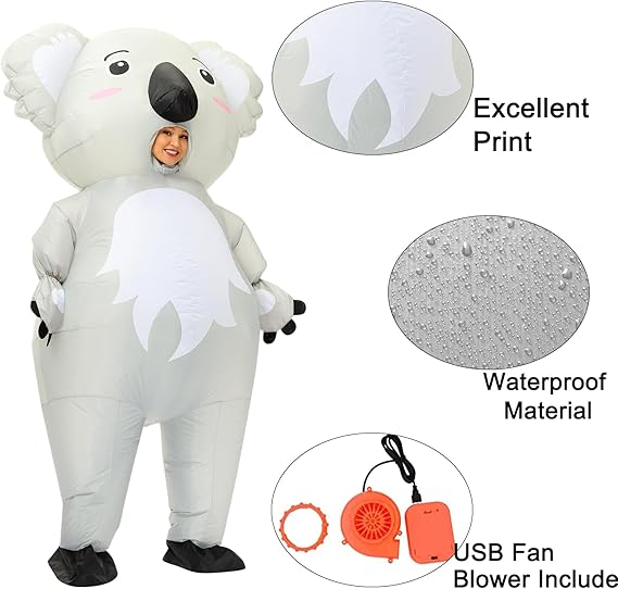 Koala costume adult suitable for most adults.Koala blow up costumes package include 1 x inflatable Koala costume,1 x usb mini fan blower,Koala suit mini fan is requires 4 AA batteries and inflatable Koala costume adult USB connected mobile power(inflatable Koala costume not including battery)