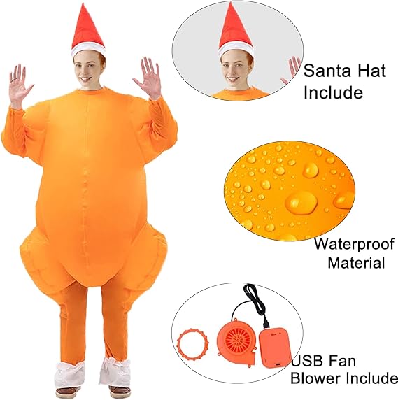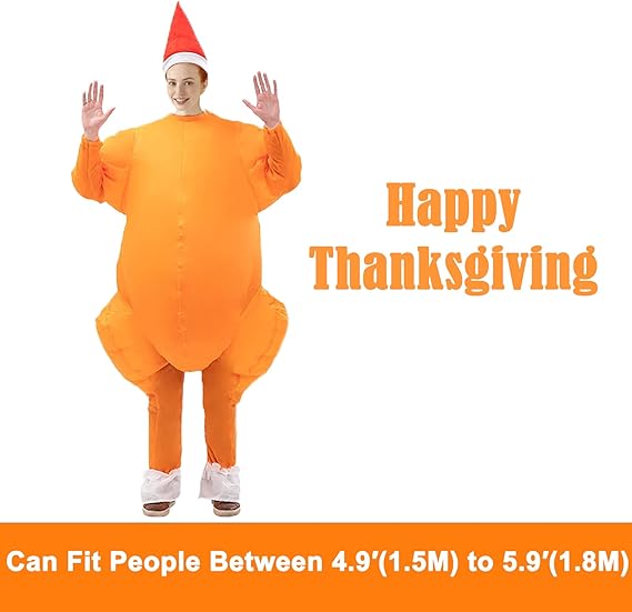 PACKAGE INCLUDE:ZISUEX Turkey costume adult suitable for most adults.Turkey blow up costumes package include 1 x inflatable Turkey costume,1 x usb mini fan blower,Turkey suit mini fan is requires 4 AA batteries and inflatable Turkey costume adult USB connected mobile power(inflatable Turkey costume not including battery)