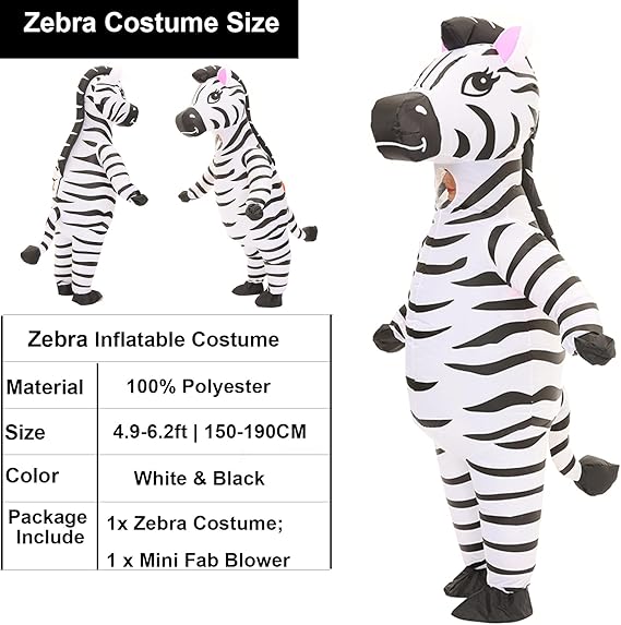 - ZEBRA SUIT SIZE:inflatable zebra costume adult body suit is large and zebra costumes for adults plus size design zebra costume for women inflatable costume adult suitable for the people between 4.9ft(1.5M) to 6.2ft (1.9M).zebra inflatable costume for boys zebra blow up costumes for adults can fit for almost people