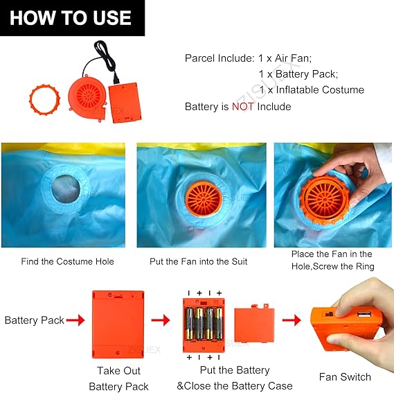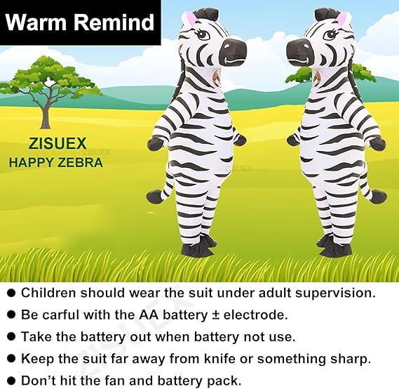 - ZEBRA COSTUME PACKAGE INCLUDE:zebra inflatable costume suitable for most adults. zebra suit package include 1 x zebra inflatable costume,1 x usb mini fan blower,zebra costume for men mini fan is requires 4 AA batteries and USB connected mobile power(not including battery)